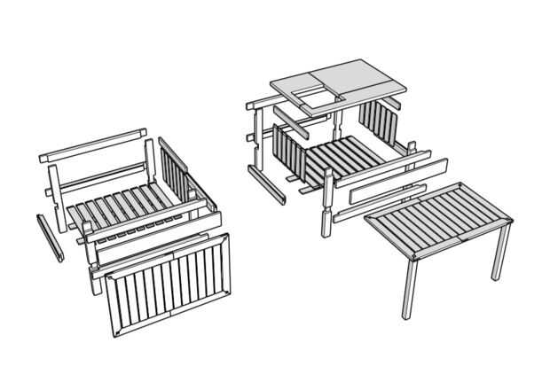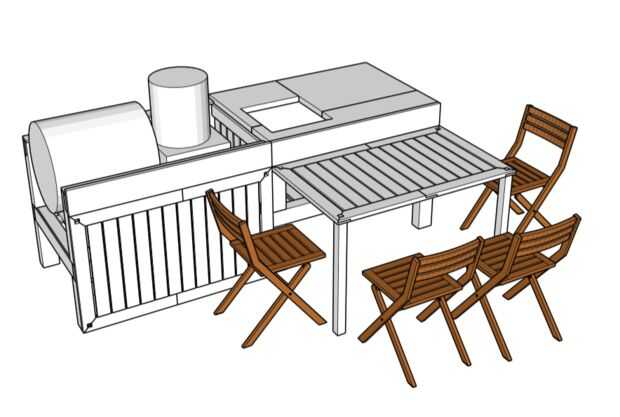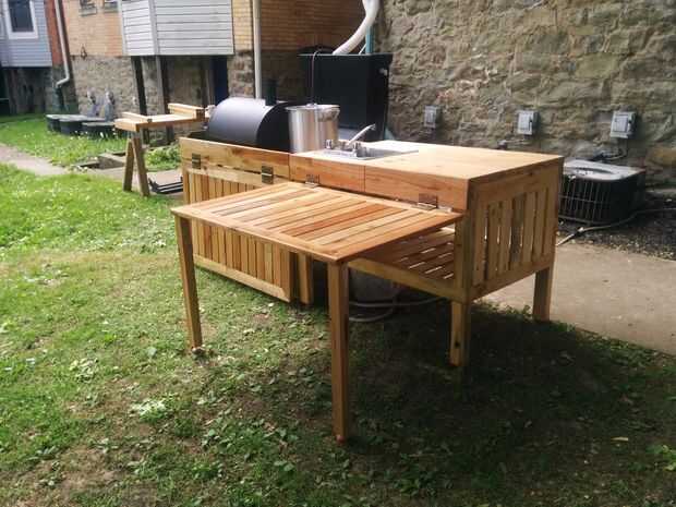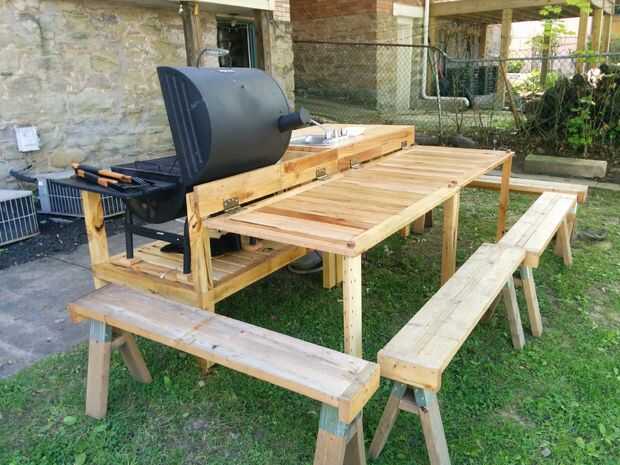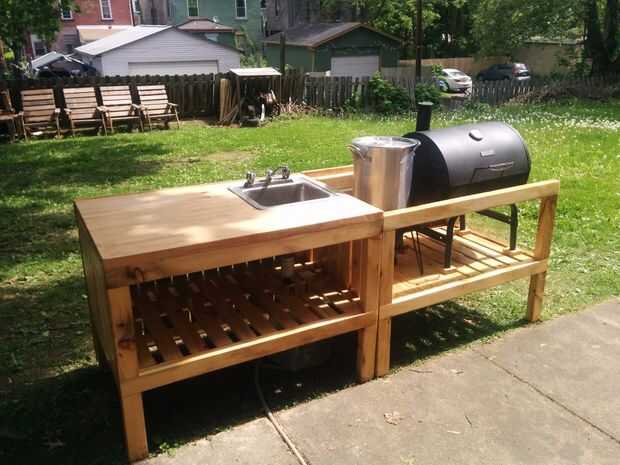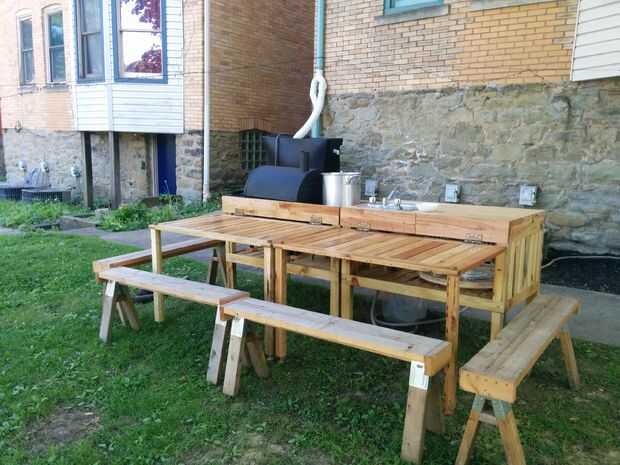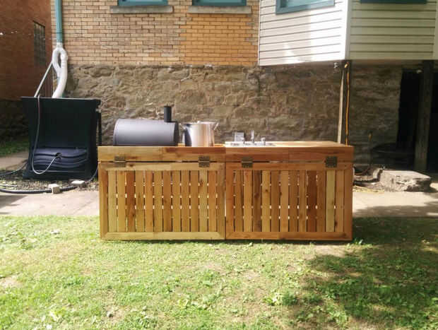 Las únicas piezas de las unidades que no eran materiales reclamados son los tornillos, la plomería y el poliuretano. Todo lo demás, incluida la parrilla (ya poseído), sartén de Turquía (usado), encimera de bloque de carnicero (sobras), fregadero y bisagras (reutilización de la construcción) y madera (tarimas y maderas de jardín), provenientes de materiales recuperados, repurposed o reutilizados.