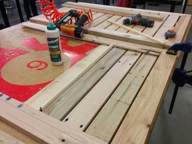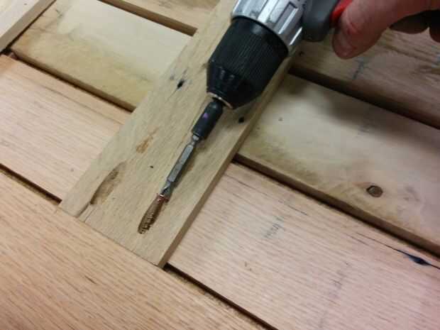 También tomé 4 piezas de 1 "x 3" x 29 "stock de palets de madera y corte gratuito inglete medio vueltas en ambos extremos para crear piezas laterales de la tapa de tabla (básicamente un marco para los listones, similares a los estantes de mediados en los cadáveres). Ver este vídeo para obtener más información acerca de la creación a inglete vueltas medio.