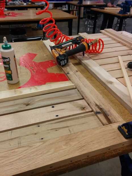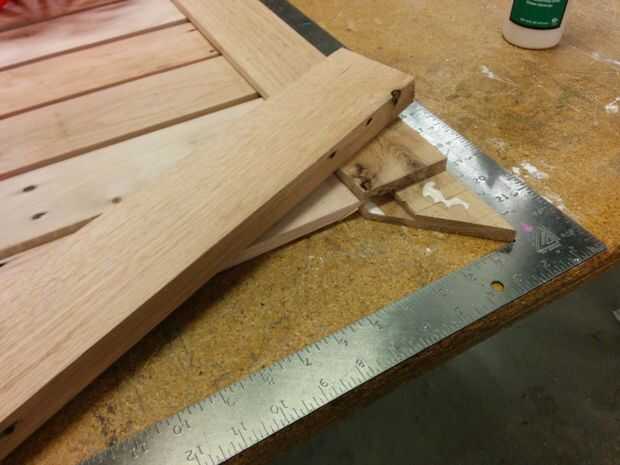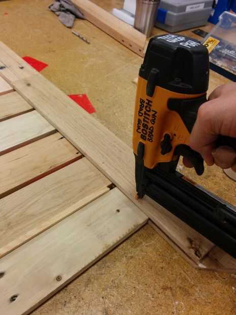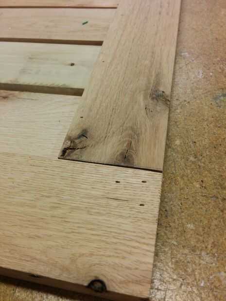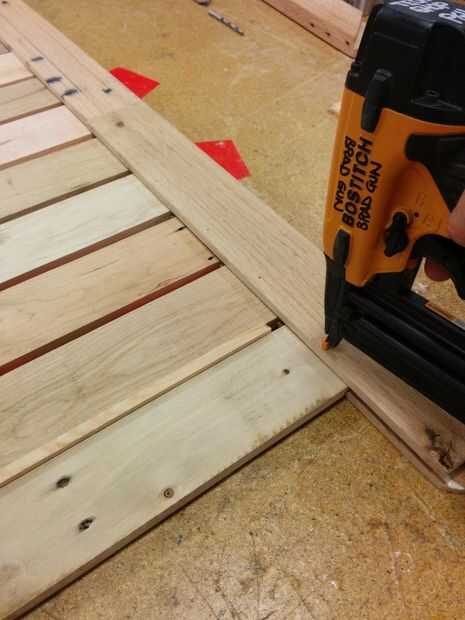 Se unió a los bordes inglete con pegamento y clavos, ajuste las lengüetas de los listones en las ranuras y utiliza un ~3/4 "espaciador para establecer el espaciado antes de fijar con más pegamento y clavos.