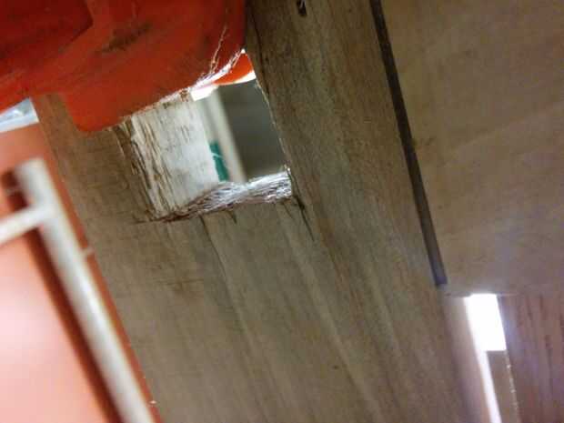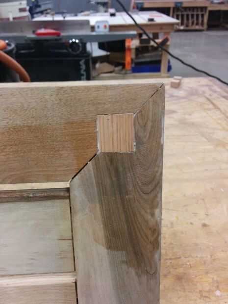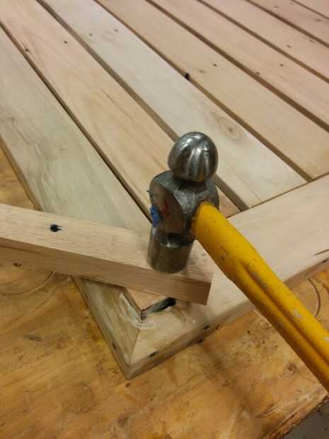 Después de un breve período de frustración y la autocrítica, aligeró para arriba. Este proyecto utiliza madera reciclada, después de todo - simetría perfecta es imposible, y el único que realmente se notara o cuidado me quedaría. Me tomó esto como una oportunidad para remendar práctica y decidieron usar contraste de colores de madera para poner de relieve el parche, en lugar de tratar a la máscara. Había pegado y sujeta las piezas astilladas de la mortaja, luego hice algunos bloques de tamaño para ajustarse a los agujeros. Después de lijar los bloques para un ajuste apretado, cubrió los bloques y los agujeros con pegamento, luego utiliza un trozo de madera y un martillo para conducir los bloques.