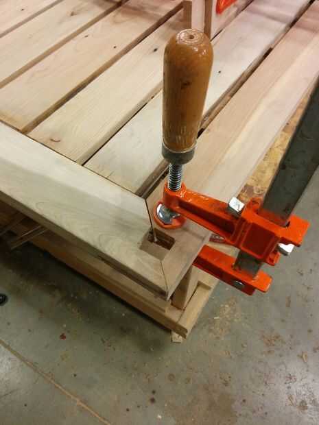 Originalmente, tenía la intención de las patas de la mesa establecer dentro de la mesa sin hardware, solamente con una mortaja y espiga en las esquinas de cada tabla. He intentado cortar las mortajas a mano después de montar las tapas de tabla, pero una combinación de débiles cinceles de madera, óptimos, y mi propia inexperiencia llevó a terribles juntas.