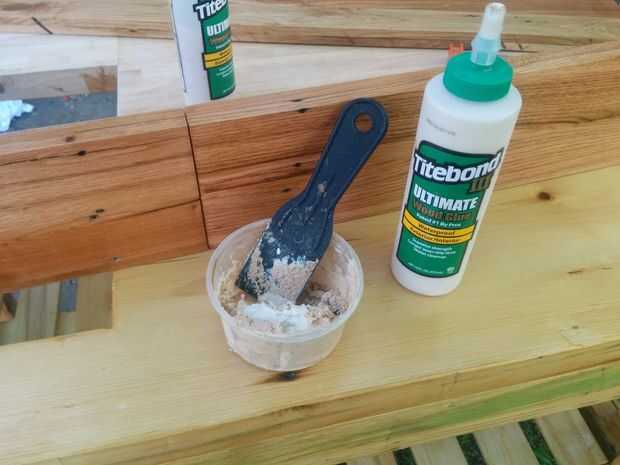 El resultado se veía sorprendentemente bien - después de rellenar los huecos con masilla para madera (me gusta una mezcla 1:1 de aserrín y madera pegamento) y lijarlos, los parches se convirtieron en un acento decorativo a la tapa de tabla. Los pocos que han notado incluso los parches pensaban fueron intencionales y ha gustado mucho el look de la madera contrastante.