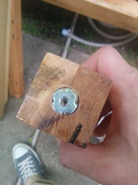 (Esto no es una configuración ideal para las piernas, porque la tensión de apriete de los tornillos quiere tirar la tuerca en T de las piernas, en lugar de en. Fui esta ruta después de mi intento inicial de mortajar una patilla cuadrada para las piernas no y probablemente debería haber vivido un poco más de tiempo pensar en cómo abordarlo. Una mejor solución habría sido usar un tornillo de máquina de madera combinada en la pata de la mesa y luego una tuerca en la cima de la tabla para sostenerla en lugar.)