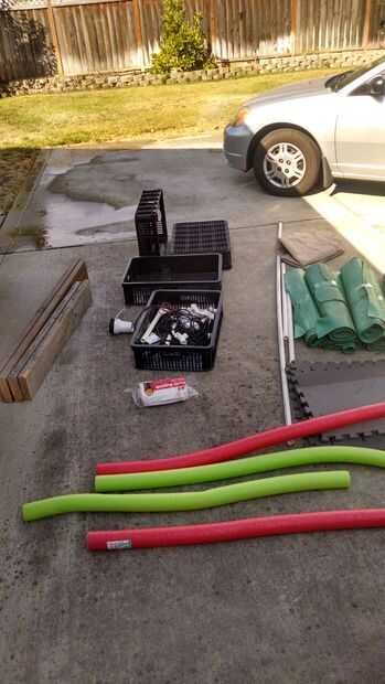 Cajas o palets de plástico - utilicé cuatro cajones mide 24 "x 16" x 6 ". Los encontré en craigslist. un palet de plástico funcionará también.