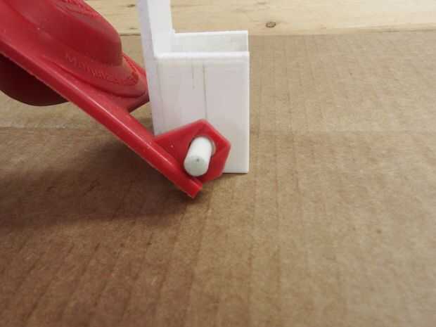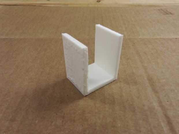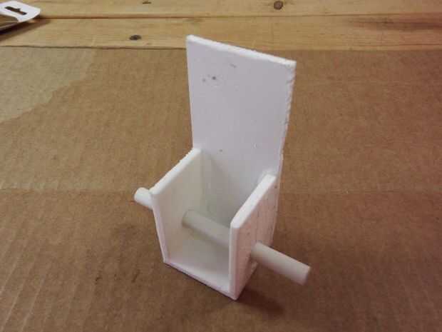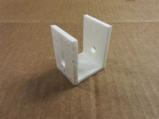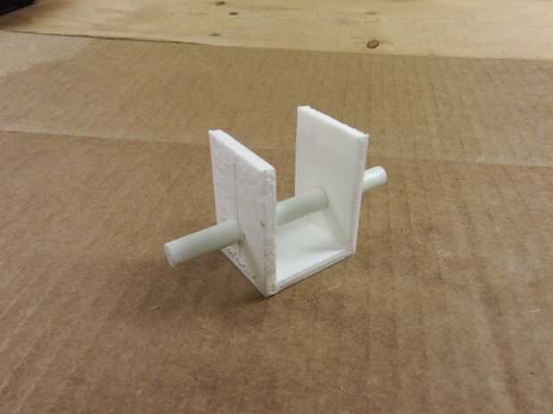 El primer paso es hacer el montaje para la válvula de charnela. Hay un par de maneras diferentes para hacer el montaje. Tuve la suerte de tener acceso a una impresora 3D para esta pieza, pero si no lo hacía, habría tomado un pedazo de 1/8" espesor aluminio stock se dobló en un canal en U y perforado para acoplar la barra cruzada. La parte inferior de la montura debe ser bastante plana para facilitar el montaje al cubo. Afortunadamente, mi hijo tenía una clase de redacción en la escuela y ofrece dibujar e imprimir el Monte para mí. Es 1/8" de espesor, 1" de ancho y 2" de altura. Los agujeros son ¼"(mismo tamaño que la varilla de fibra de vidrio) y perforaron 3/4" de la parte inferior. El tercer lado más grande fue pegado en más adelante para restringir el movimiento de la aleta de descarga para que no abra demasiado.