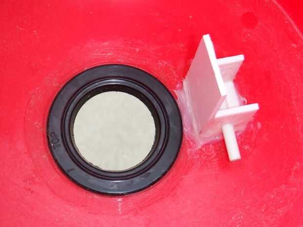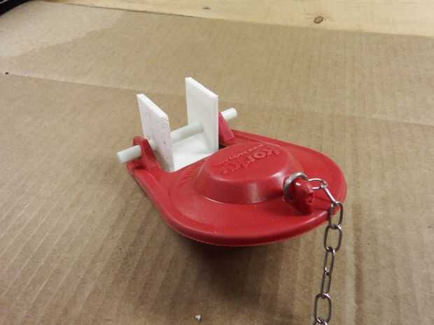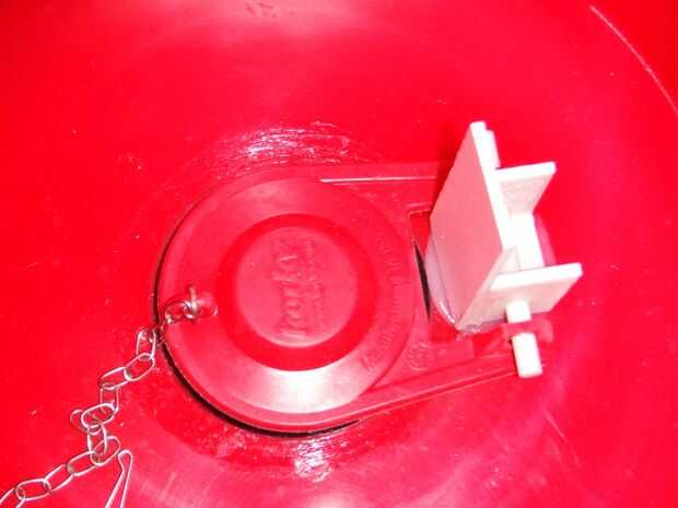Ahora puede perforar un agujero en el centro inferior de la cubeta que es ligeramente más grande que el agujero del anillo aleta asiento y luego fije el asiento usando sellador de silicona. Esta parte es opcional si usted no tiene el aro del asiento pero muy recomendable para obtener un buen sellado de la válvula de charnela. Una vez que la silicona haya curado, instalar a la trampa en el Monte y alinee sobre el agujero de drenaje. Utilice sellador de silicona más para garantizar el montaje y todo dejar reposar hasta que la silicona esté completamente seca. Quite la cadena que viene con la aleta.