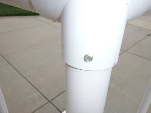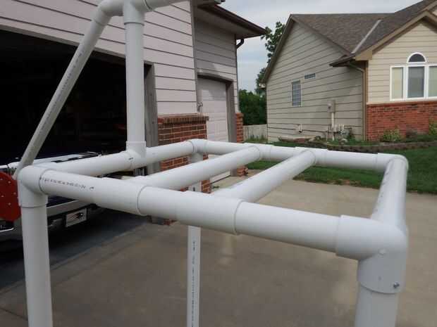 Ahora solo tienes que poner 60" pieza en cada uno de los codos de esquina inferior y poner el conjunto superior en la parte superior 60" piezas. Pegar 60" piezas en cualquiera de los extremos por lo que pude desmontar la estructura para el almacenamiento pero asegurar las piezas en los codos de esquina con tornillos autoroscantes.