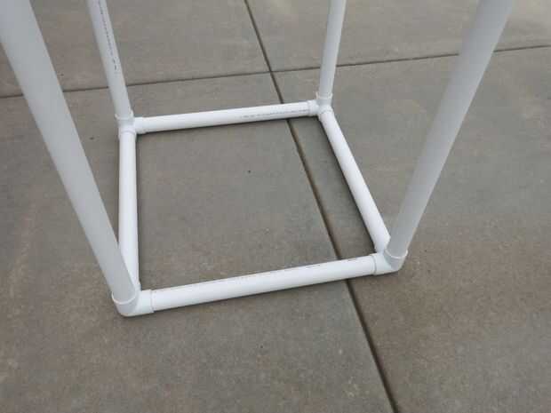 Hacer primero la parte inferior del marco pegando 4 de 30" pedazos en un cuadrado con 4 de los codos de 90 grados con salidas laterales (se llaman estos piezas esquina codos) asegurándose de que todo es cuadrado y nivel.