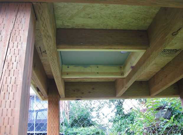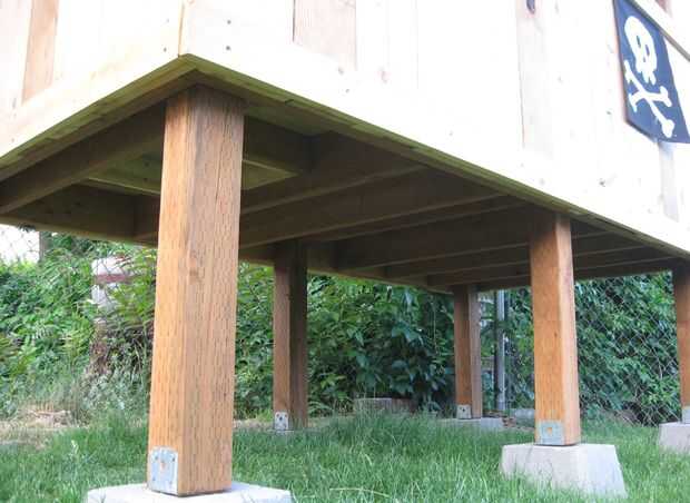 Trabajando desde la plomada, anclado post agregué presión tratado 2x6s en el exterior de los postes para crear el marco para el piso. Estas placas fueron Unidas con 3" tornillos exteriores, con cinco tornillos en cada poste a través de cada tablero. Los agujeros se pretaladran a través de la 2x6s y en los postes con un 3/16" afilado poco avellanado.
