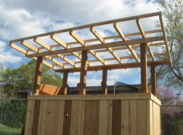 Cortado 3" fuera de los puestos traseros para conseguir el ángulo deseado. Dos 10 pies 2 x 4 se instalaron vigas de centrado en la parte superior de la frente y detrás los mensajes. Estos fueron atornillados desde arriba hacia abajo en la parte superior de los postes con tornillos exteriores de 3".