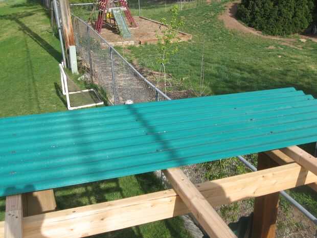 Los paneles de techo son marca "T" calaminas de policarbonato celular de The Home Depot. Cada panel es de 26" por 8'. Lo bueno de estos paneles es que cinco de ellos instalar perfectamente a 10 pies de ancho (cada dos paneles correspondientes superponen 2"). Había cortado 14" de la longitud de cada uno y había instalado con tornillos de techo (tipo con arandelas de goma incorporada).