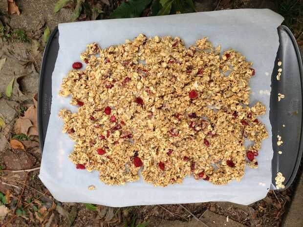 Distribuida uniformemente sobre la placa para hornear forrada con y hornear durante 30 minutos a 300 grados (revolviendo una vez en la marca de 15 minutos y una vez en la marca de 25 minutos).