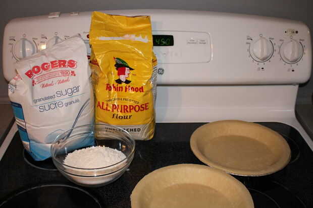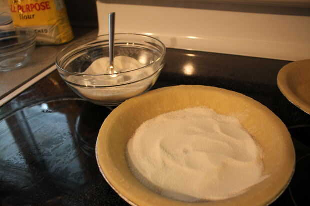 Añadir una capa de la mezcla de azúcar y harina en el fondo de una de las conchas de pastel.