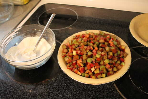 Vierta la mezcla de azúcar y la harina restante sobre el ruibarbo. Dar la tartera un poco batido para colocan la harina y el azúcar en todos los espacios entre los trozos de ruibarbo.