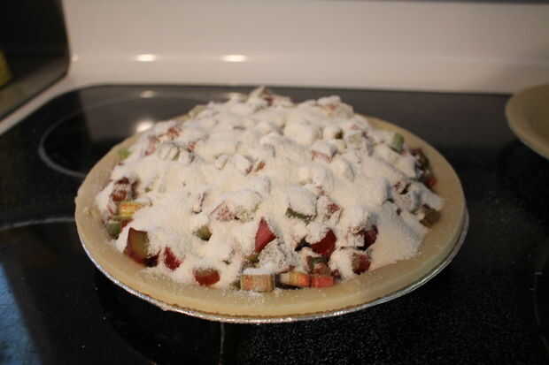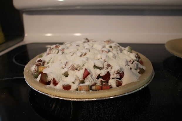 Rellenar la tarta con un montón de colmada de ruibarbo.