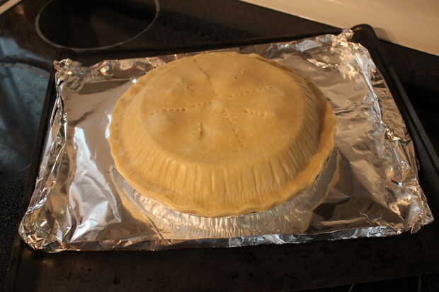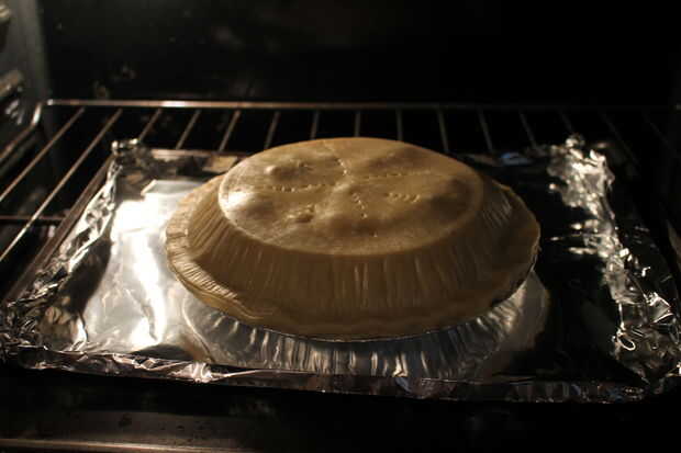 Si, como yo, no estás totalmente seguro de en qué tan bien han sellado los bordes de la tarta, colocar la tarta en una bandeja para hornear. La única hoja de cookie que pude encontrar no tenía un labio alrededor de los bordes, así que añadido papel de aluminio para contener cualquier relleno de pastel que se escapa.
