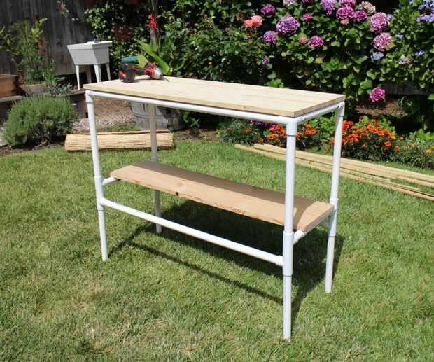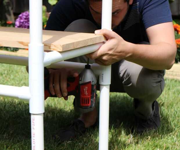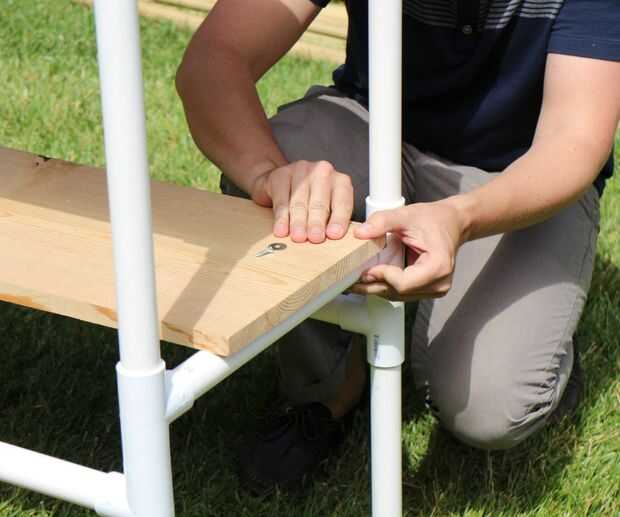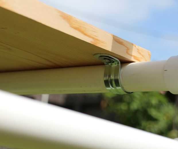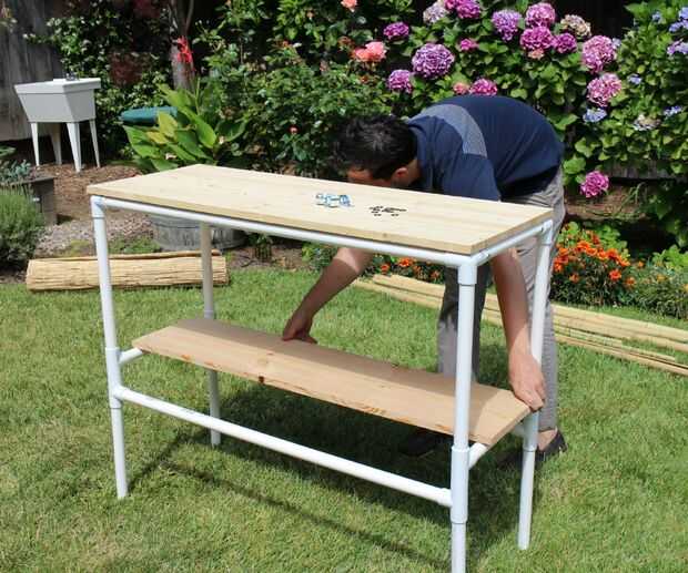 Tomar el estante 12 "x 48" y colocarlo sobre los soportes transversales que están a medio camino encima de las piernas.