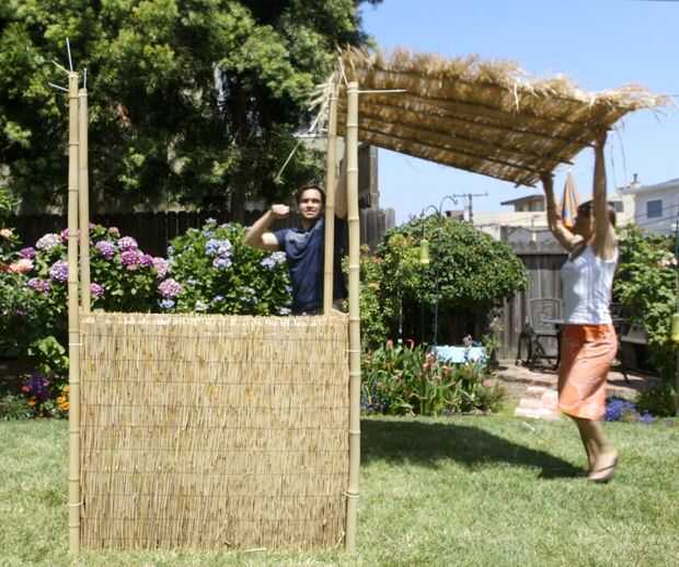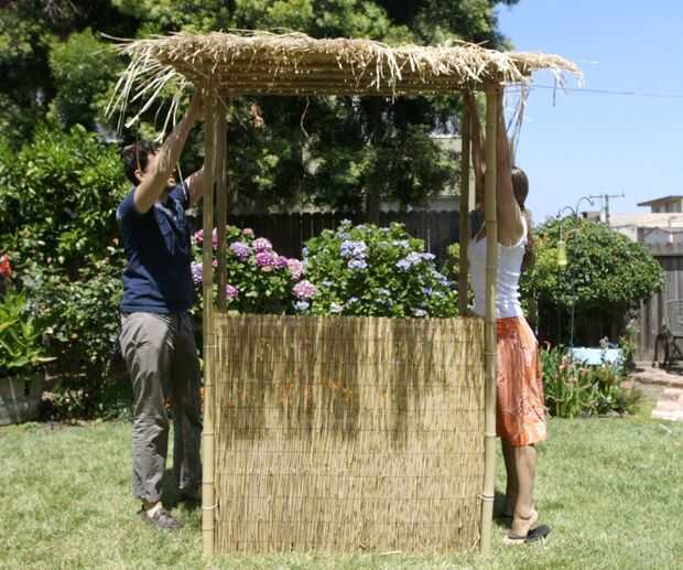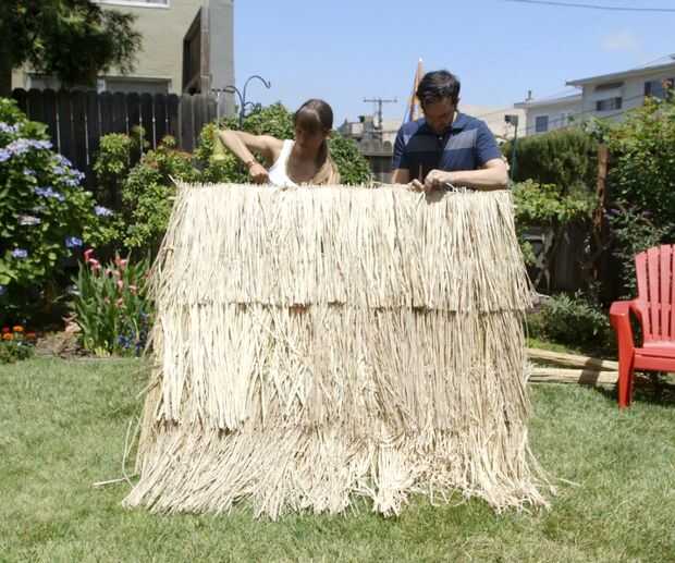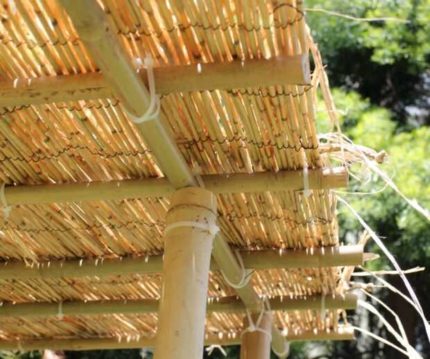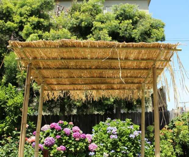 Una vez que termines comprobar (y fijación si es necesario) Levante la cubierta, borde delantero alineado con el borde delantero de la barra y colóquela sobre los postes de bambú.
