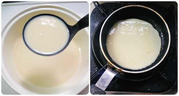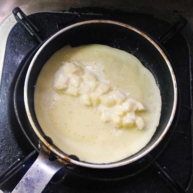 Llenar la cuchara de caldo con masa y vierta cuidadosamente una fina capa de masa en la sartén, asegúrese de que la capa es redonda,