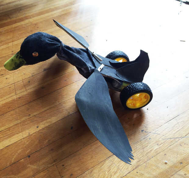 Es un pato mecánico que aletea sus alas como rollos remite.