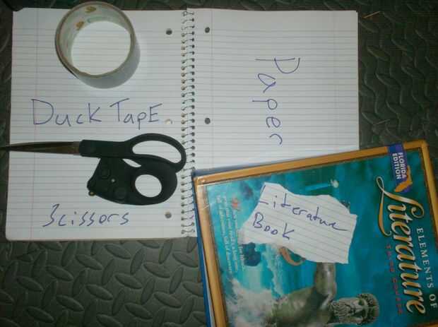 Cinta pato!!!!!! Tijeras (opcionales, para aquellos que no pueden romper la cinta) Papel Superficie que no compromete el palo de la cinta (trabajo escolar de libros fino)
