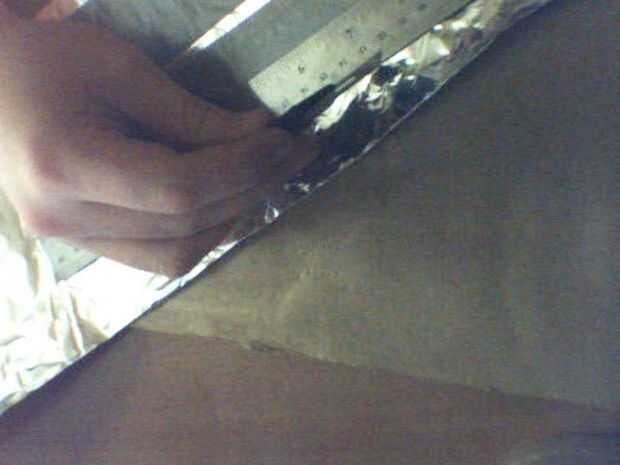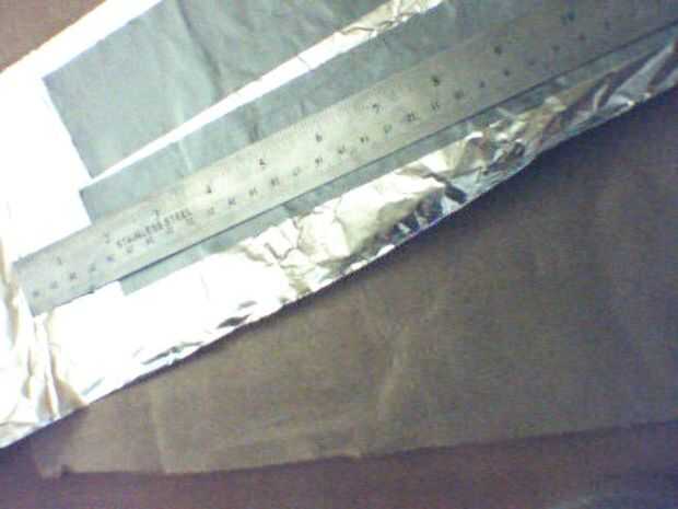 LAF está parado para el laminado de aluminio - en este caso va a utilizar papel de aluminio doméstico que es laminado con cinta de embalaje regular. Es fuerte, durable y rasgar-resistente. Es flexible, conductor, fácilmente cortado, doblado o en form