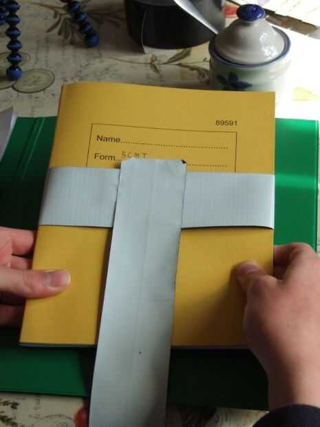 Este medio lazo de la cinta detendrá el libro de resbalamiento. Posición del bucle que acaba de hacer en el libro para que sea al menos la mitad para arriba. Entonces, poco más de cinta y pega el extremo de él en el lazo, otra vez el lado adhesivo hacia fuera. Llevar alrededor de la parte de atrás y hacer lo mismo. Me pareció más fácil de cortar la cinta primero en este paso.