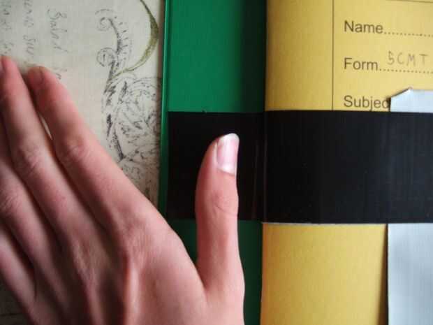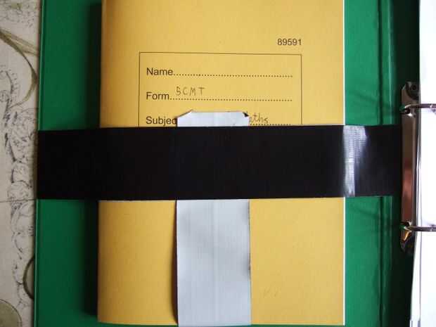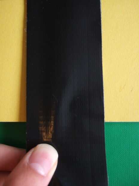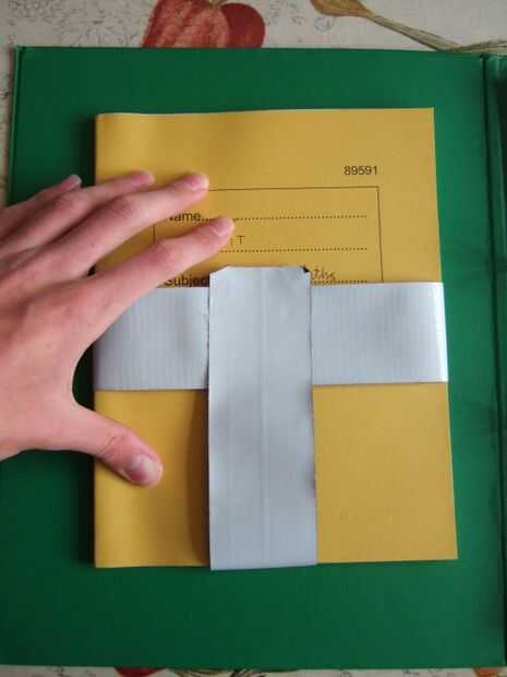 Luego, corte un pedazo de cinta lo suficiente para cubrir el lazo en la parte delantera y queda unos 5 cm de cinta en cada extremo. Esta es la parte difícil. Necesita poner este pedazo de cinta sobre el lazo, con como poco mostrando blanco como sea posible. Cinta pato es pegajosa; cinta pato pegando a la cinta de pato más es instantánea, por lo que tiene ser primera vez.