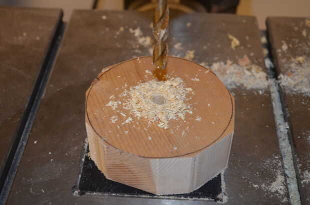 En primer lugar, usando un taladro para asegurar un agujero vertical, taladrar el agujero para el eje de cada rueda, de tamaño por lo que el árbol sería un ajuste apretado de la espiga. Para conservar un agradable acabado exterior de la rueda, perfore un agujero de bolsillo en lugar de todo el camino a través de la perforación.
