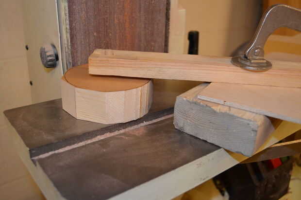 Si usted no tiene un torno de madera, las ruedas son casi imposibles de cortar círculos exactos sin una plantilla de algún tipo. Algunas personas tienen buena suerte usando una plantilla para hacer girar la rueda de la sierra, pero utilicé una lijadora de banda para redondear las ruedas de corte.
