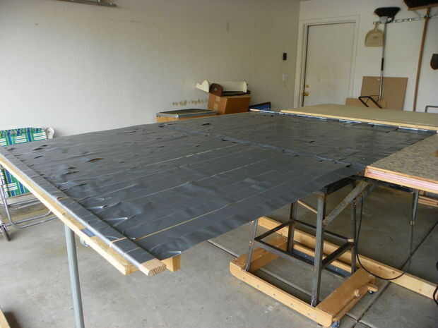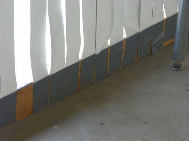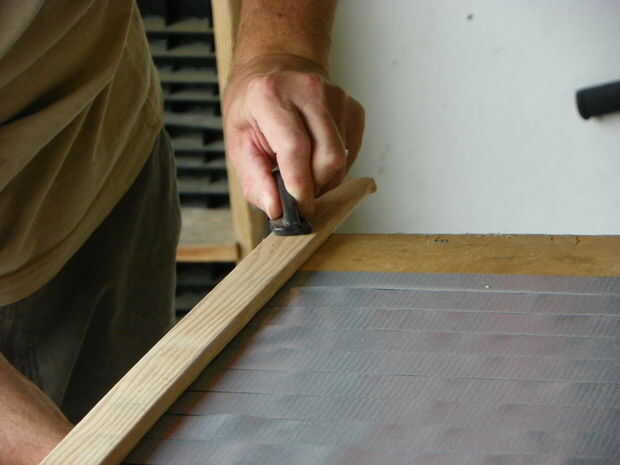 Después las tiras fueron presentadas (26 en total), a continuación, los trozos de madera fueron añadidos a cada extremo y fijados a la mesa así que no se mueva. Las tiras de cinta fueron dobladas sobre sí mismas. Más vueltas llegó a la mitad de la hamaca que da mucha fuerza para que no separe.