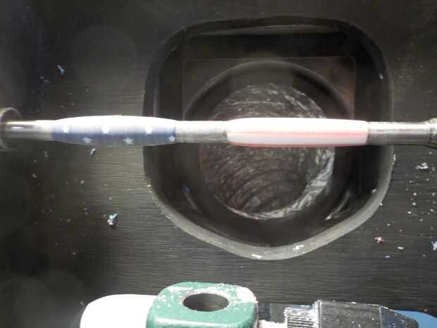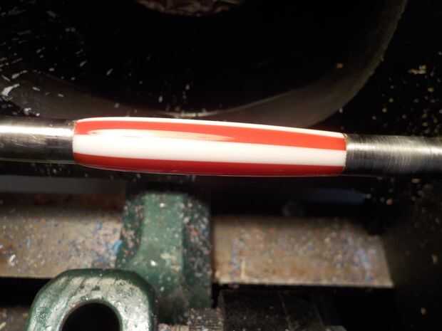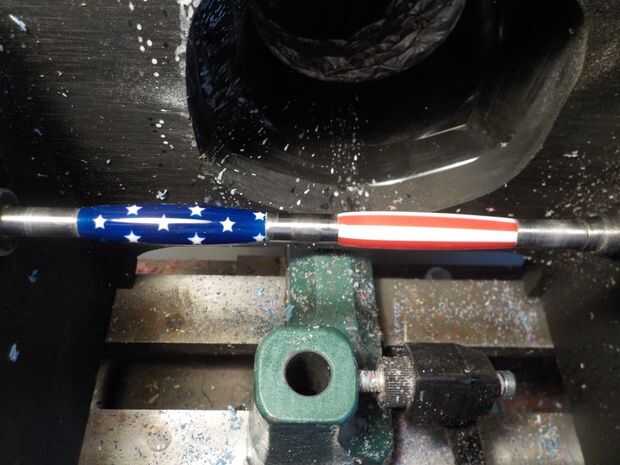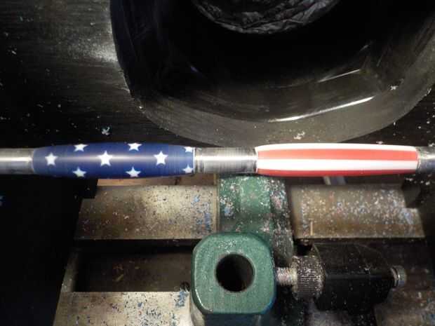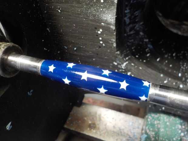 Ahora montar cada espacio en blanco mi mandril de pluma con los bujes no engorda. Me arrancar mi mini torno velocidad máxima (2800 rpm) y empezar a girar. Me gusta utilizar un 3/4" diagrama de instalación gubia pero también he disfrutado convirtiendo plumas con una gubia de husillo de baja estriado 1". Baje los espacios en blanco hasta obtener una forma que me gusta y los extremos son agradables y al ras con los bujes. Después del rodaje, yo lije cada uno en blanco con 180, 240, 320, 400, 600, 800 y un bruñido con 2000. Es muy importante ir a través de los granos uniformemente y hasta en los granos de alta con acrílicos. El objetivo con lijado de acrílico es reducir la arena cero también un tamaño que el ojo humano no puede ver, así que hace lucir brillante y brillante. Así que quite las marcas de herramienta con grano 180 y luego quitar los arañazos de grano 180 con grano 240. Luego cero 240 grano de arena consigue quitar con 320 y así sucesivamente. Este proceso se detiene en el bruñido con papel de lija del 2000 pero se reanuda con un tipo diferente de papel de lija, micro malla. Malla micro es una serie de papel de lija de grano super fino para pulir acrílicos y plásticos. Comienza en alguna parte alrededor de 1500 y se mueve hacia arriba a través de una larga serie de granos a 12.000. Se trata de la misma teoría de la eliminación de arena cero anterior con un rasguño incluso más fina arena hasta que se ve brillante y pulido. Ahora, puede dejar pulido allí, pero me gusta usar un compuesto pulidor automotriz a poner realmente una superficie vidriosa sobre la pluma. Yo uso un paño húmedo para mantener la acción de corte fresco y suave. Me aplique una gota del compuesto en el paño y empezar a pulir la pluma con el torno a alta velocidad. Después de eso, se realiza el giro.