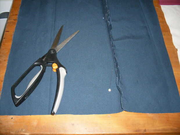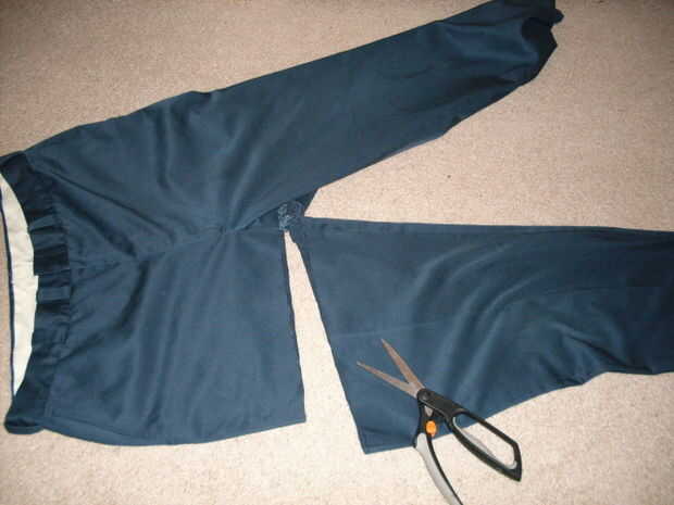 Cortar las piernas; luego cortar la entrepierna para abrir la pierna. Cortar el dobladillo inferior.
