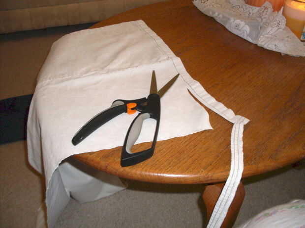 Los pantalones va a querer arrugarse, así que tire para arriba en un extremo, el perno, luego coser plana. Corte el sobrante.