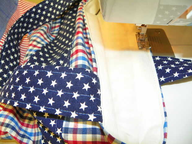 Coser alrededor del borde entero del bolso, 1/4" de la parte superior. Cosa alrededor de otra vez 1/4" a continuación de la primera fila de la costura. Esta doble hilera de puntadas reforzará las manijas.