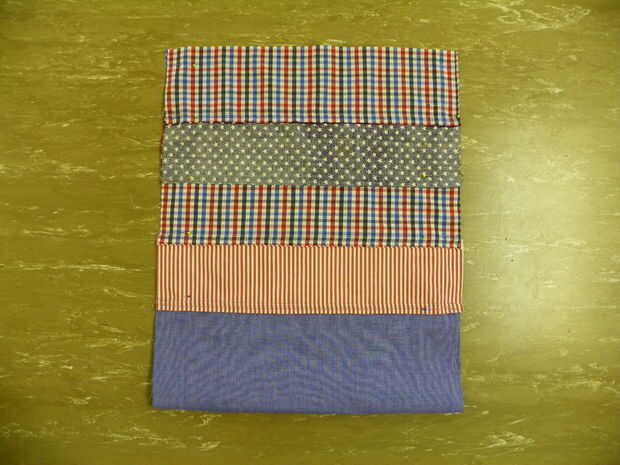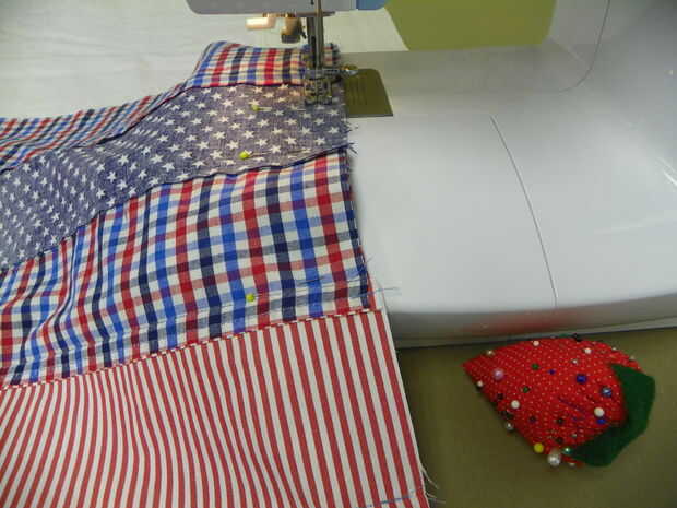 Ponen las piezas de la bolsa hacia fuera. Coserlos junto con margen de costura de 1/2". Pulse las costuras hacia la parte inferior del bolso. Puntada en cada costura. Esta sección debe ser 15" de ancho x 37" de largo. Doblar por la mitad y perno de lados. Coser lados de bolsa con margen de costura de 1/2".