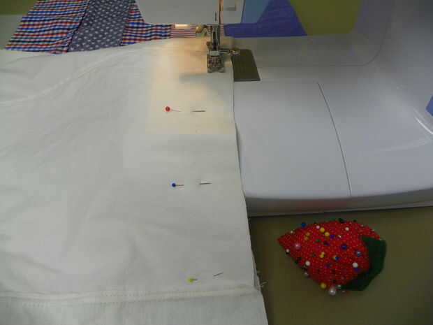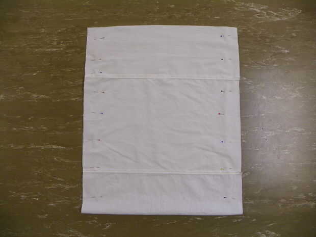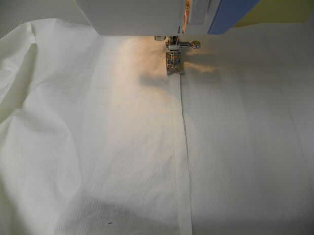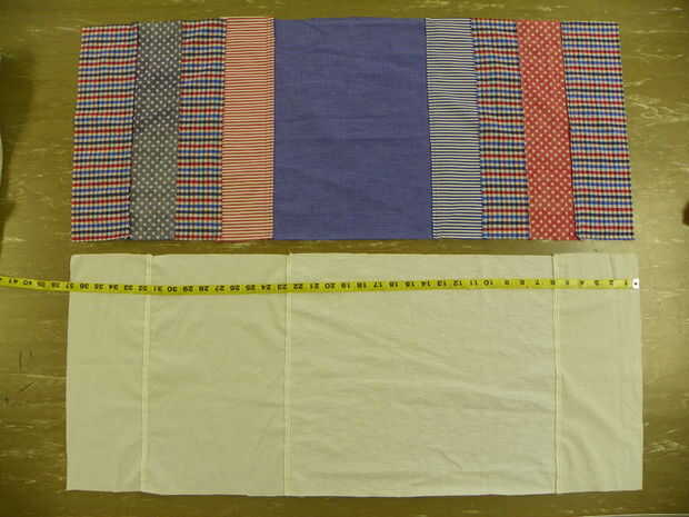 Cortar varias piezas 15" de ancho para la guarnición. Hasta 37" de largo, unirlas. Plancharlos a un lado y puntada. Doble forro en medio, pin. Lados del forro 1/2" del borde de la puntada.