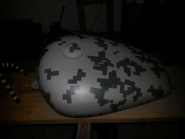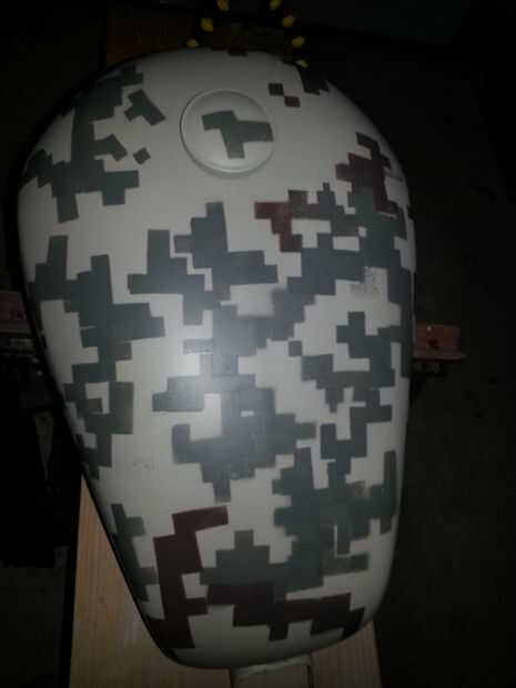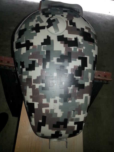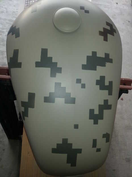 Con aerosoles muy ligeros, rocía el patrón del tanque. Lo que lo hace tan lento es que tienes que dejar que cada capa seque antes de colocar la plantilla en otro lugar. Si la plantilla en la siguiente área se superpone sobre el baño mojado, te roce lo y lo arruinara.