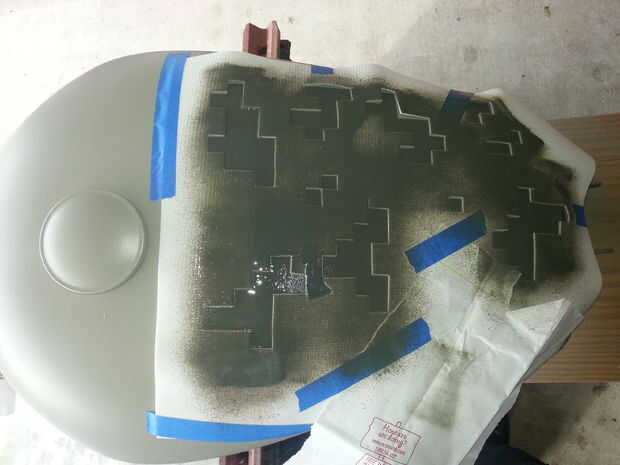 Me Coloque la plantilla sobre el tanque y suavemente la cinta en su lugar con cinta de pintor. Bastante sencilla y explicativa de los cuadros.