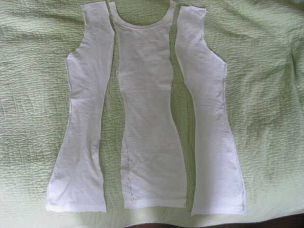 también, corte a lo largo de los hombros de lado y las costuras de la camiseta del brazo.