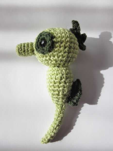 Montando el caballito de mar es bastante sencillo; coser el hocico y una cresta en la cabeza, coser la cabeza al cuerpo y coser la aleta con el cuerpo.