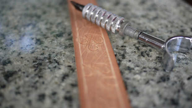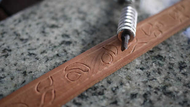 Un montón de patrones de gato tiene manchas que son al azar en forma pero siguen un patrón cuando se observa la piel en su conjunto. Corte colocaciones punto 2-3 juntos y trabajado hasta la longitud de la correa a través de una lámina de cuchillo estándar. Estos recortes van en la parte superior de su "pelo '" marcas.