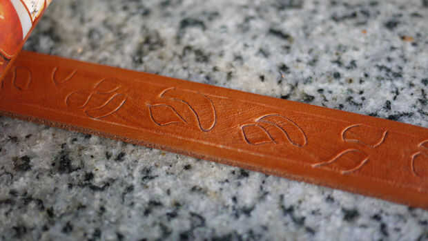 Usé un tinte acrílico en color naranja para crear mi primera capa de tinte. Este es el color base. Fui bastante liviano (apenas un skim con un trapo). En el resto de la banda repetí la tinción hasta era perceptiblemente más oscuro para crear una sensación de degradado.