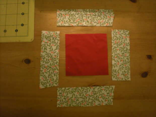 , Empieza con 4 tiras de mi grupo de diversos colores.  Estas tiras son 1 1/2" de ancho.  Para obtener la longitud, poner las tiras hacia fuera como en la foto y cortarlas de 1/2" más de la Plaza del centro de cada lado.  Esta medida no tiene que ser exacta, por lo que es más largo que el borde de la Plaza.