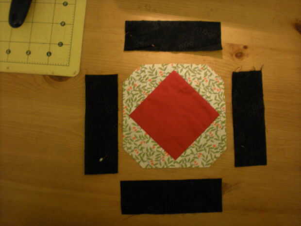 Ahora vamos a coser nuestras 4 tiras oscuros sobre los ángulos de 45 grados que sólo se cortan. Gire la pieza para que la Plaza está de pie en una de sus esquinas, por lo que es como un diamante. Ahora colocar 4 tiras de 1 1/4" ancho oscuro tela. Cortar otra vez, por lo que son