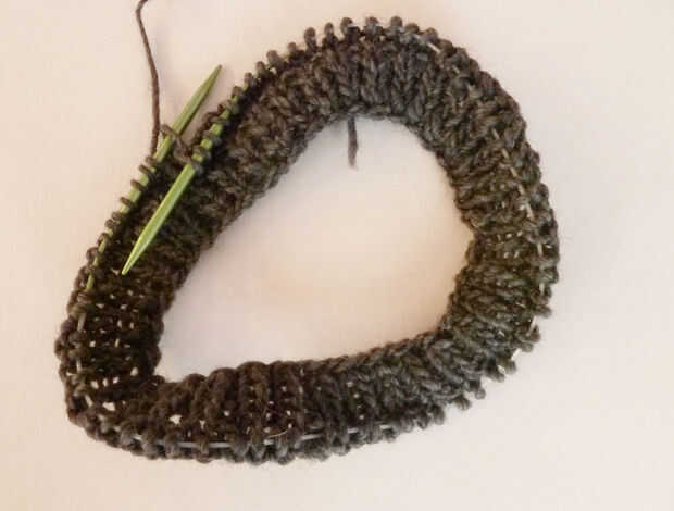 Por nervaduras, trabajan el sombrero en un punto 2, 2 revés para aproximadamente una pulgada. Me gusta utilizar un marcador de punto para indicar donde empecé a punto elástico así que puedo dejar en el mismo punto, pero realmente no es necesario.