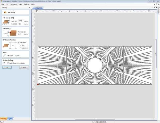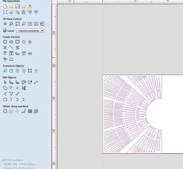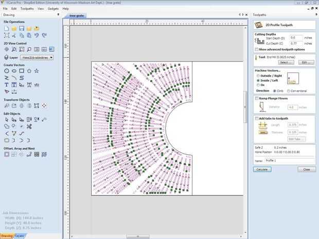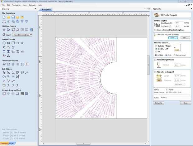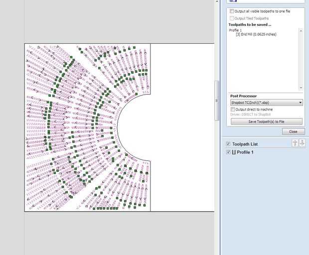 Ahora es el momento para utilizar el programa para editar vectores, CNC. Para esto utilizaremos el software V-Carve, que a los efectos de la talla de planar es totalmente adecuado. Una vez has abierto V-Carve, seleccione la opción para abrir un archivo existente, en este caso el dxf que guardó. La imagen debe transferir a la ventana V-talle y le con algunas preguntas. Le pedirá que compruebe las dimensiones del dibujo, así como el espesor del material que se talla en. Para dar a esta pieza un sentimiento completo 3-dimensional, a ser tallado en madera contrachapada de 3/4", así que asignar un valor de espesor 0,75. Usted también querrá confirmar que la broca va a empezar su corte en la superficie superior del material que se va cortando en. También asegúrese de que en el cuadro "xy referencia" hacer clic en el círculo de la parte inferior izquierda como esta orientará correctamente la imagen en cuanto a donde estará el material que estás cortando en. Asegúrese de confirmar que las unidades de medida son en pulgadas. Para cortar los paneles de forma eficiente, va cortando cada panel individualmente. Seleccione el primer panel central que dibujó y pasar al punto 0 de la x y eje y, que será evidente como allí es una caja blanca rectangular que se adapta a su dibujo en. Seleccione solamente el patrón de trabajo dentro del panel y elija la opción de pestañas caminos de herramienta abierta bajo trayectorias de herramienta abierta. Habrá un botón de camino de herramienta que usted puede hacer clic en. Esto le indicará con más opciones para confirmar. En este cuadro verás un cuadro de profundidades de corte, caja de herramientas, caja de vectores de la máquina, rampas descenso movimientos de caja, agregar fichas a la caja de herramientas de trazado, un cuadro de nombre posición y perfil y un botón de calcular. Usted querrá asignar la profundidad de corte Inicio en 0,0, que significa que el router comenzará a sumergirse en la superficie de su material. La profundidad de corte le dirá cómo profundo desea que el router a hundir totalmente y dependiendo de la profundidad del material, V-talle asigna automáticamente el router pasa cuántos debe hacer de forma segura y totalmente corta el material. Usted puede asignar manualmente cuántos pases desea que el router para hacer, pero estar seguro solo que el programa asigna la cantidad de pasadas dependiendo de la broca y la velocidad del huso. Para asegurarse de que el router CNC atraviesa completamente el material, asignar la profundidad de corte ligeramente mayor que el espesor real del material. En este caso, asignaremos un 0,77 profundidad de corte. Dado el hecho de que sólo estamos cortar de madera contrachapada, seleccione una herramienta del molino de extremo en el cuadro de selección de la herramienta. La herramienta debe tener ajustes automáticos para la velocidad del husillo y velocidad de avance. Otra vez, manualmente puede cambiar, pero para este proyecto, vamos a dejar la configuración automática en. No desea que la velocidad de rpm para ser demasiado lento con una velocidad de avance que es demasiado alta, que puede causar la broca de fresadora romper. También quiere asegurarse de que esté seleccionando un pedacito del molino extremo que no exceda de la anchura de las formas elípticas en que se talla. Un 1/4" bits es bastante estándar y bastante seguro de romper proporcionando no alterar velocidad de la broca y ajustes de la tasa de alimentación de manera perjudicial. Usted querrá seleccionar la opción de vectores correctamente la máquina, que básicamente te pregunta cómo desea que el router para cortar sus líneas a continuación. Puede seleccionar un afuera, adentro, en la línea de corte. Ya que son talla material lejos dentro de sus marcas de elípticos, se debe seleccionar el interior corte. Para este proyecto no necesita preocuparse sobre el cuadro de movimiento de penetración de rampas o el cuadro de agregar pestañas. Ahora usted está listo para calcular. Pulse el botón calcular y V-talle calculará automáticamente una trayectoria de herramienta para su router de corte y título específicamente esta trayectoria de la herramienta. La ventana también le mostrará las flechas direccionales y puntos verdes para demostrar cómo se moverá el router en su material. Cierre la ventana de path y observará en la pantalla de fichas de camino de herramienta que no existe un cuadro denominado perfil 1 comprobado. Es la trayectoria de la herramienta para el trabajo de patrón interno. Haga clic en el botón que se parece a un disco duro. Esto ahorrará su trayectoria de la herramienta como un archivo de v-talle. Esta trayectoria de la herramienta está lista para utilizar para el corte con router CNC.