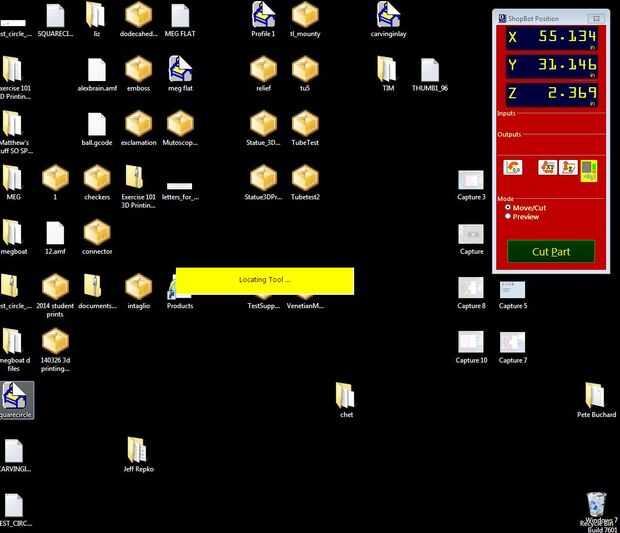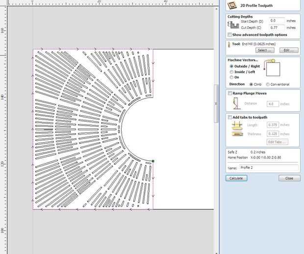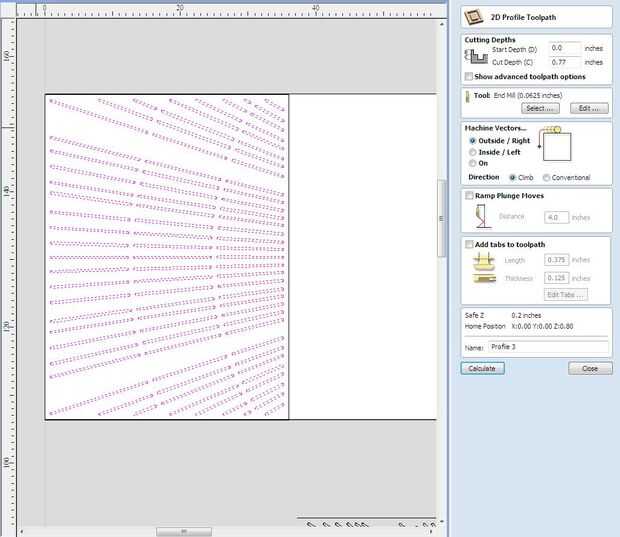 Después de que ha hecho la trayectoria de la herramienta para el trabajo de patrón interno, usted querrá hacer una trayectoria de herramienta para el parámetro exterior de paneles completa para cortar con precisión el panel al tamaño y para cortar el semicírculo central. Naciones Unidas-el perfil de 1 casilla en la ventana ruta de pestañas. Vuelva a hacer clic en el botón de trayectorias de herramienta. Esta vez sólo haga clic en el parámetro exterior del panel. Mantener todos sus ajustes de corte el mismo a excepción de opciones. Para la caja de vectores de la máquina, haga clic en la opción corte exterior para asegurarse de que el panel se cortará con las dimensiones exactas. Además, en el cuadro de agregar pestañas, haga clic en la opción de agregar pestañas. Esto es para asegurarse de que el panel se recorta se conectará al material que la máquina es cortar. Esto es para evitar que el panel se mueva fuera de lugar cuando el router es cortarlo de la totalidad del material a cortar en. Con ninguna lengüetas el panel no tiene nada que colgarse una vez que se corta en el material. Una vez que haya agregado las fichas, haga clic en calcular, y otra vez V-talle calculará una ruta de corte para el parámetro exterior del panel. Esta trayectoria de la herramienta es señalado ahora como perfil 2. Otra vez guardar esta trayectoria de la herramienta pero con un título diferente. Puesto que los dos paneles centrales son idénticos, un par de trayectorias de herramienta es suficiente para el proceso de corte. Básicamente puede ejecutar dos veces el mismo sistemas de caminos de la corte. A continuación, usted querrá asignar trayectorias de herramienta para los paneles de dos extremos de la pieza. Todo lo que necesitas hacer es repetir los pasos que tomó con los paneles centrales de estos dos extremos. Calcular el trabajo de patrón interno primero como una trayectoria y el parámetro exterior de otra. Estos se guardarán como perfiles 3 y 4. Ahora estás listo para cortar. Abra el software que opera la máquina CNC. En este caso utilizaremos un ShopBot.