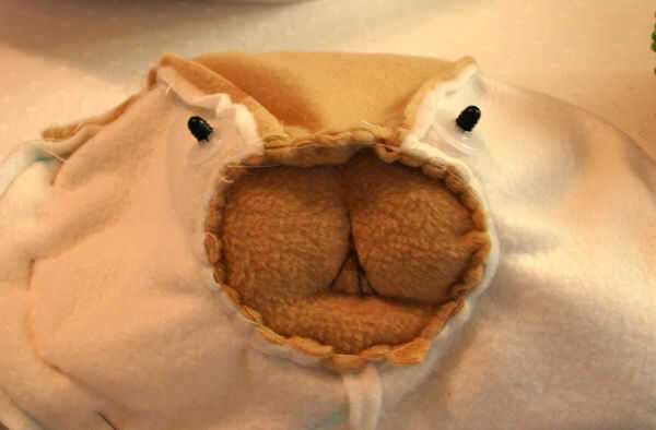 Yo doble la parte inferior de la boca para formar un labio y luego realizar dos puntadas a cada lado (mismo lugar que el pin es)