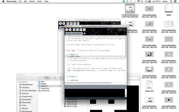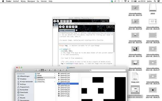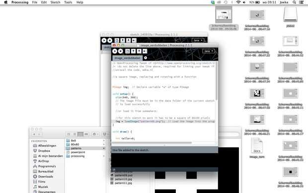 Arrastre la imagen pixelada que acaba de hacer en Photoshop en el bosquejo, procesamiento ahora automáticamente agrega esta imagen a la carpeta del bosquejo. También cambiar el nombre de 'image.jpg' en el nombre y la extensión de la imagen entre comillas (en mi caso "pattern06.png").
